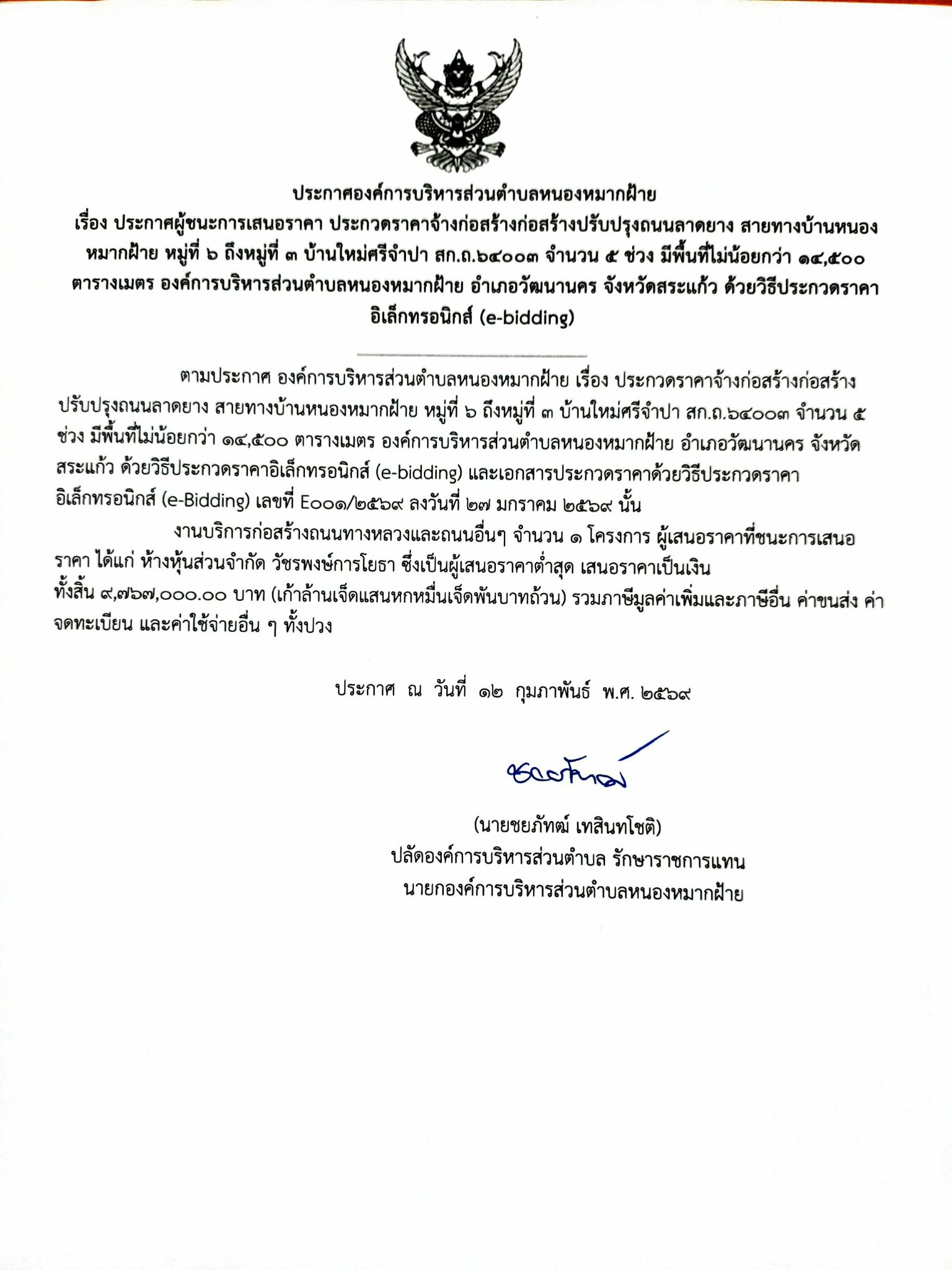 ประกาศผู้ชนะการเสนอราคาประกวดราคา |